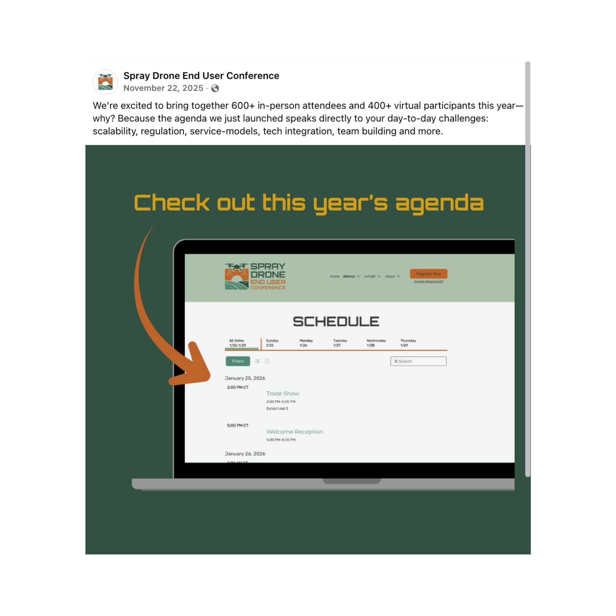 The Spray Drone End User Conference is now recognized as the premier spray drone event in North America. By creating a professional brand, digital infrastructure, and scalable systems, the conference has grown rapidly and positioned itself as the industry leader.
